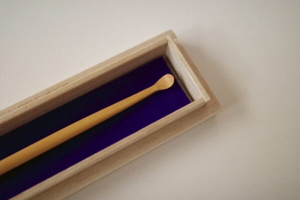 材料のつげは大変希少で鹿児島産の薩摩つげを使用し、これを乾燥して、一枚一枚丁寧に手でつくられています。使い込むほどに味わい深い飴色になっていきます。