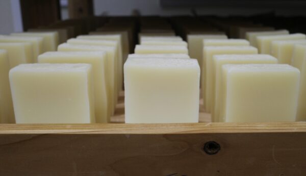 2枚目の写真は、先日九州にある工場を訪れた際に見せていただいた熟成・乾燥中の石鹸の様子です。